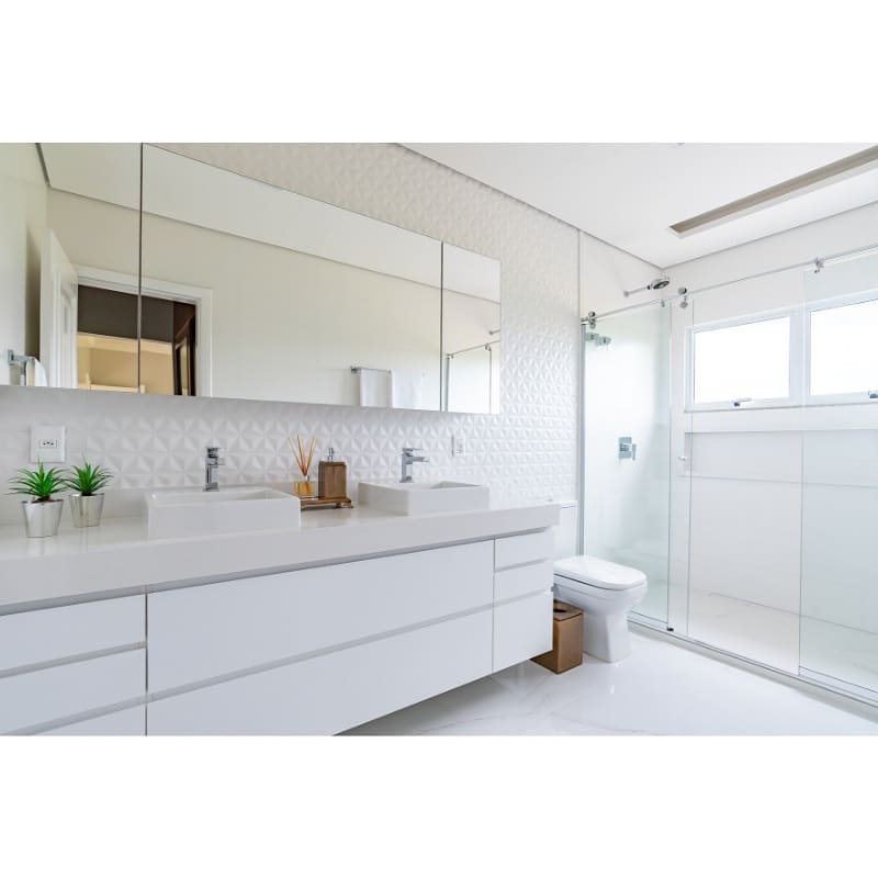 39- Com o branco, é possível explorar diversos tipos de materiais e texturas no seu banheiro.
