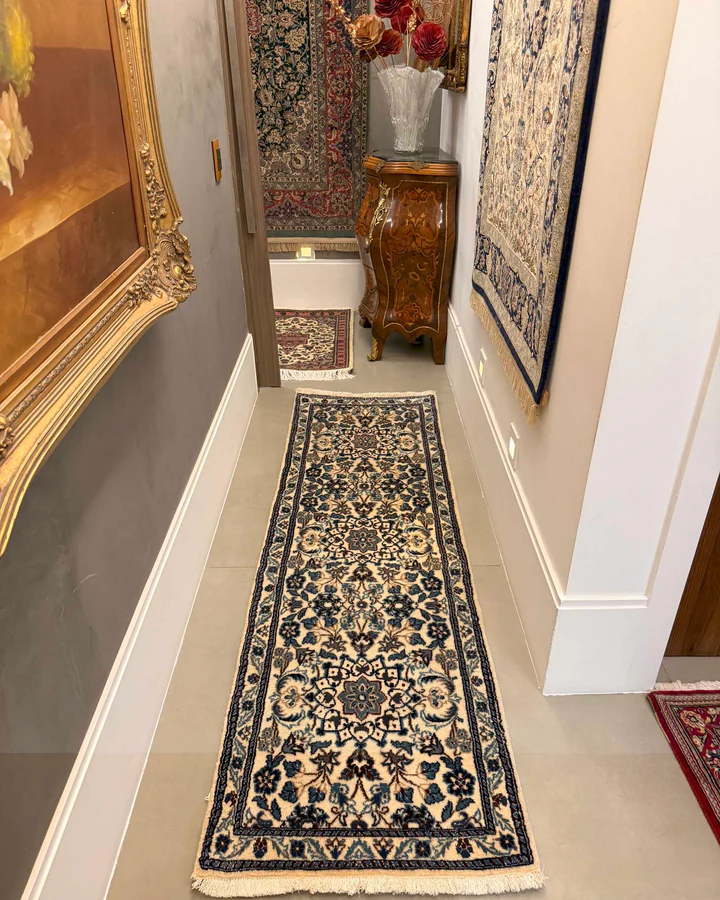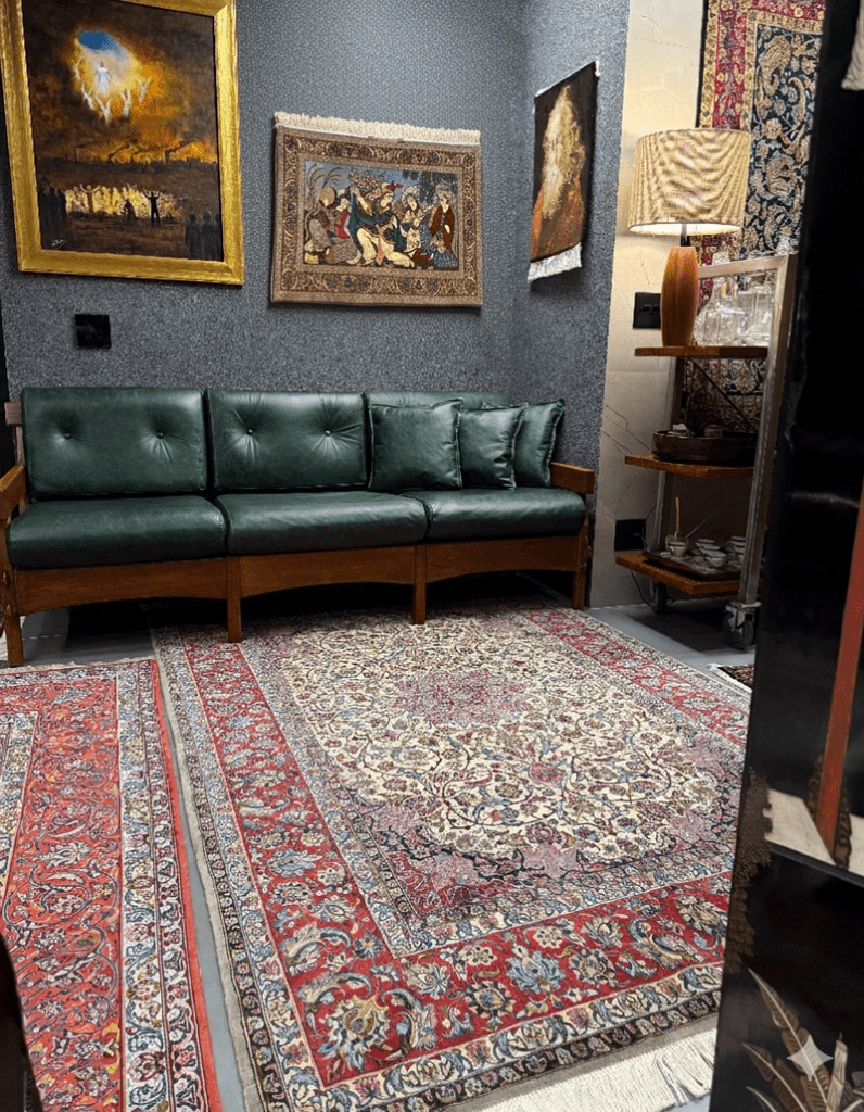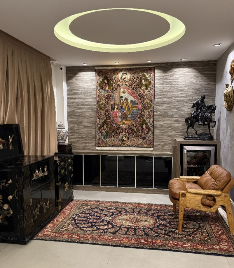 Um dos destaques é o raríssimo tapete persa Isfahan (R$ 300.000,00), produzido em lã e seda na cidade iraniana de mesmo nome. A peça retrata uma cena de celebração com músicos e mulheres persas, em detalhes tão delicados que lembram uma pintura em tecido. Suas tonalidades em azul, caramelo e vinho criam um jogo de luz e profundidade, transformando o tapete em um verdadeiro painel artístico que pode ser usado no chão ou até na parede como obra de arte.