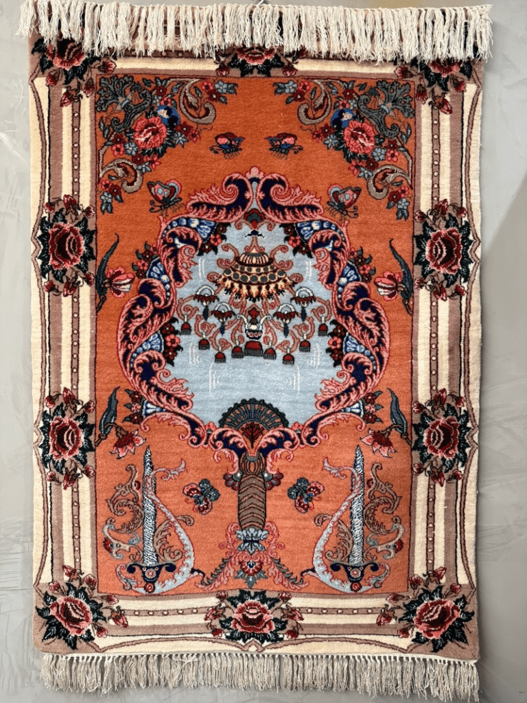 O terceiro modelo, Tapete Persa Isfahan com borboletas e flores (R$50.000,00), é uma verdadeira joia da tapeçaria iraniana. Pequeno em tamanho, mas gigantesco em beleza, sua paleta em tom alaranjado vibrante, adornado com borboletas e flores, traduz a delicadeza e a sofisticação da escola de Isfahan, considerada uma das mais refinadas do mundo. Tecelado à mão com altíssima densidade de nós, é um exemplar raríssimo no Brasil, capaz de atravessar gerações como obra de arte têxtil.